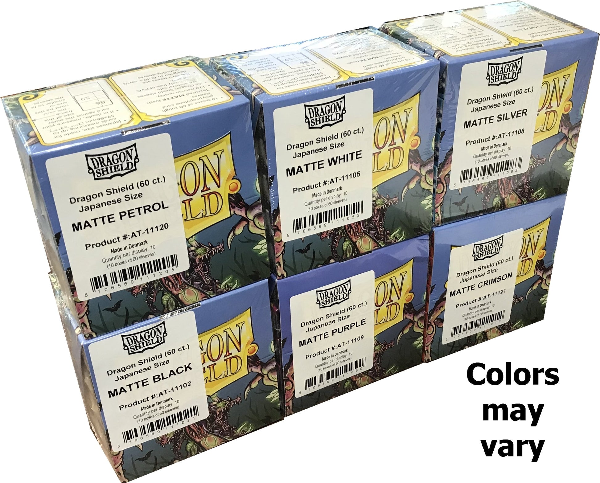 This items consists of 6 boxes/60 total packs of Dragon Shield Japanese size matte sleeves in a variety of colors (one box each of six different colors).