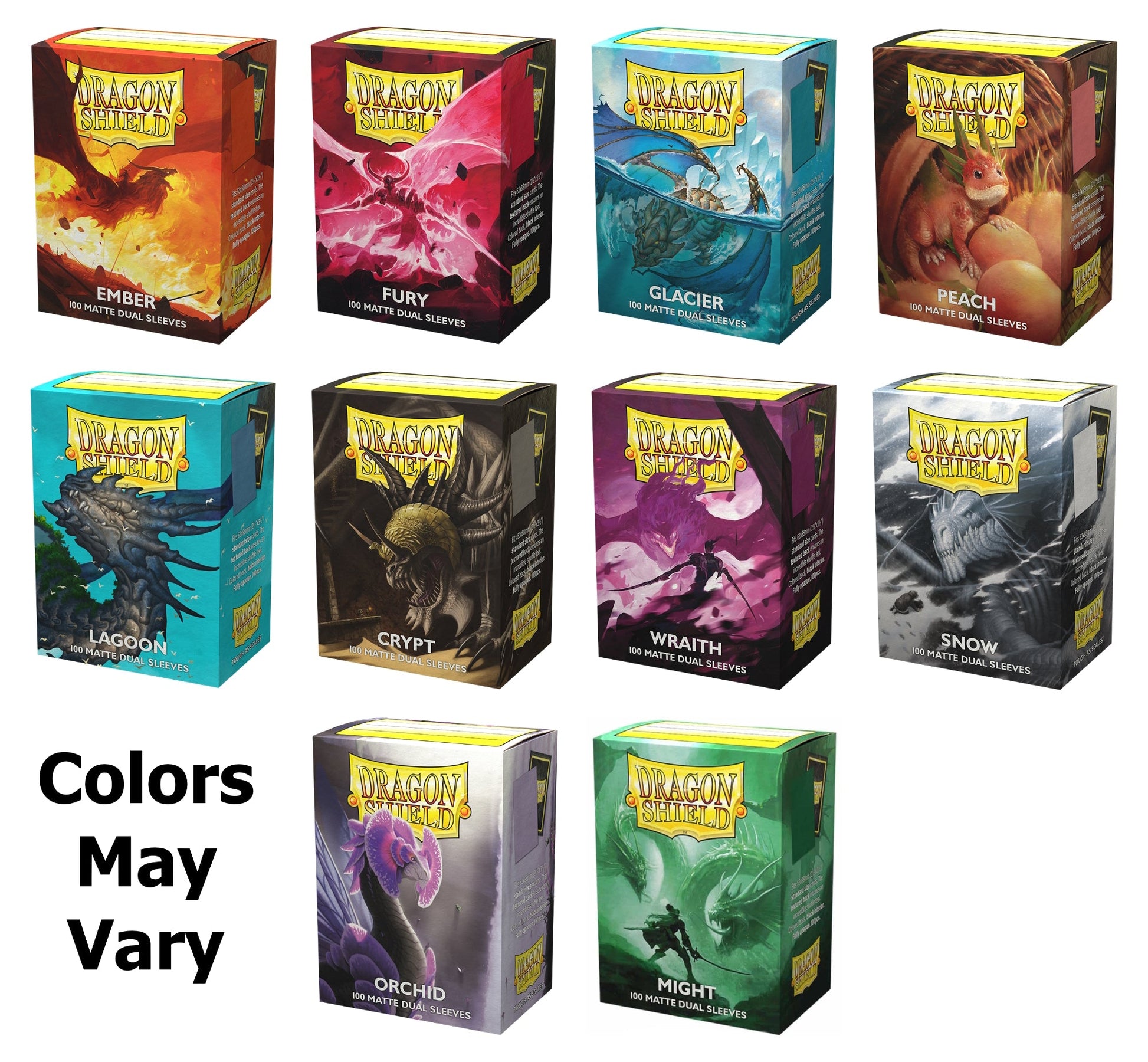 The Dragon Shield Dual Matte sleeves mix contains 10 packs of sleeves of various colors. Each pack contains 100 sleeves that hold standard size cards like Magic the Gathering, Pokemon, L5R, etc. Dragon Shield sleeves are designed to protect your gaming cards against the wear and tear of play use. Dragon Shield Dual Matte sleeves have a clear front and a textured matte back. Fully opaque sleeves with a black interior, an elegant backdrop for black-bordered cards. Each pack's sturdy cardboard box fits 75+ single sleeved cards or 65+ double sleeved cards. Every box has a label on the top for personalization. Designed for cards measuring 2.5" x 3.5" (63mm x 88mm).