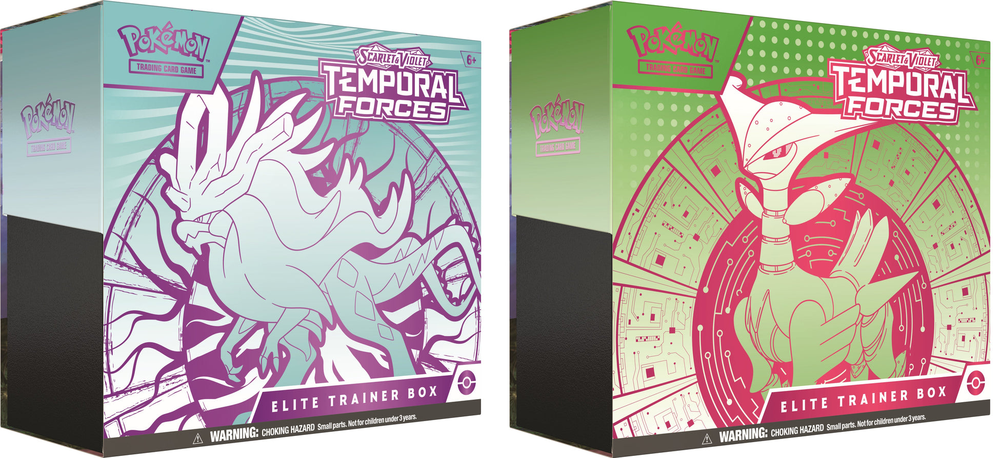 The ranks of Ancient and Future Pok‚mon continue to grow! Walking Wake ex breaks free of the past alongside Raging Bolt ex, while Iron Leaves ex delivers high-tech justice with Iron Crown ex. Outside Area Zero, Wugtrio and Farigiraf shift types as Tera Pok‚mon ex, and Pok‚mon Trainers everywhere prepare for the return of ACE SPEC cards with uniquely powerful effects. A rupture in time brings wild beasts and cyber visions to battle in the Scarlet & Violet-Temporal Forces expansion!