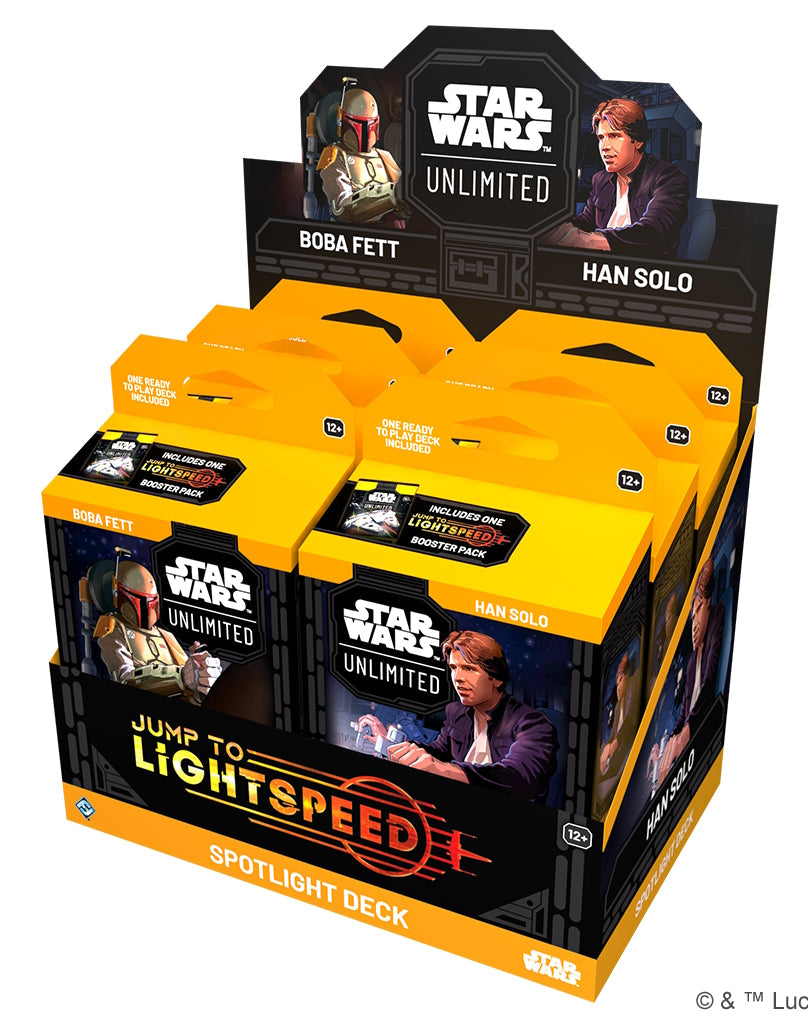 Enter a galaxy of endless possibilities in Star WarsT: Unlimited! In this fast-paced, easy-to-learn trading card game, you and your opponent face off in exciting head-to-head battles full of iconic Star Wars characters. This display contains three copies each of the Boba Fett and Han Solo Spotlight Decks! These pre-built, ready-to-play 50-card decks provides everything you need to dive into the game's fourth set, Jump to Lightspeed.